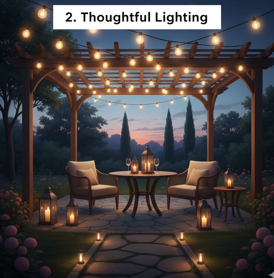 From string lights to solar lanterns to pathway lighting, illumination sets the mood and extends usability long after sunset.