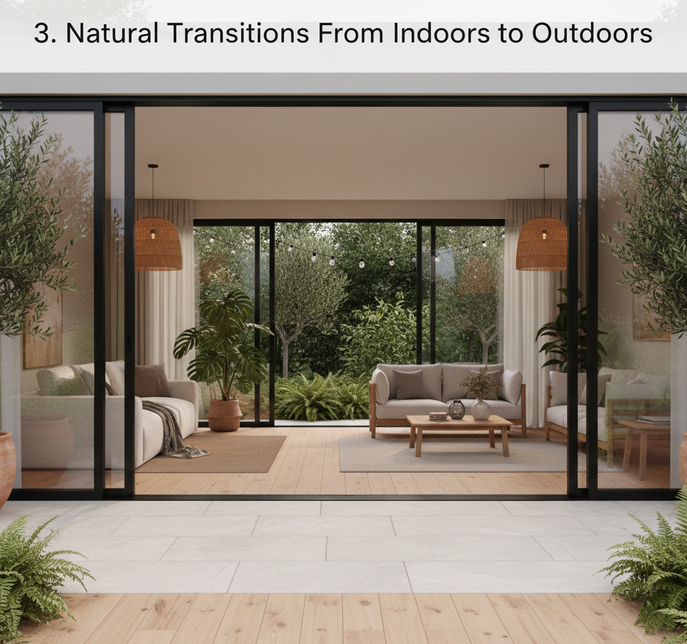 Sliding glass doors, similar flooring tones, or potted plants placed near entryways help create a natural flow that visually connects both spaces.